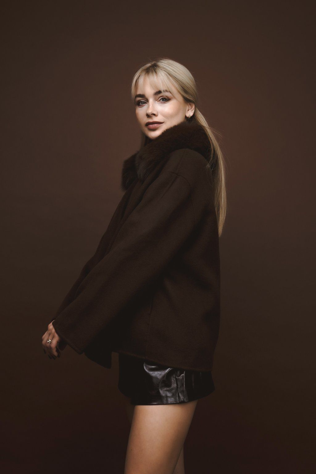 Elegant wool coat with a fur collar in chocolate color. It is made of a high-quality wool blend that provides pleasant warmth even on colder days.