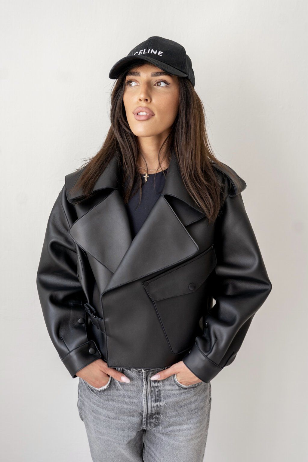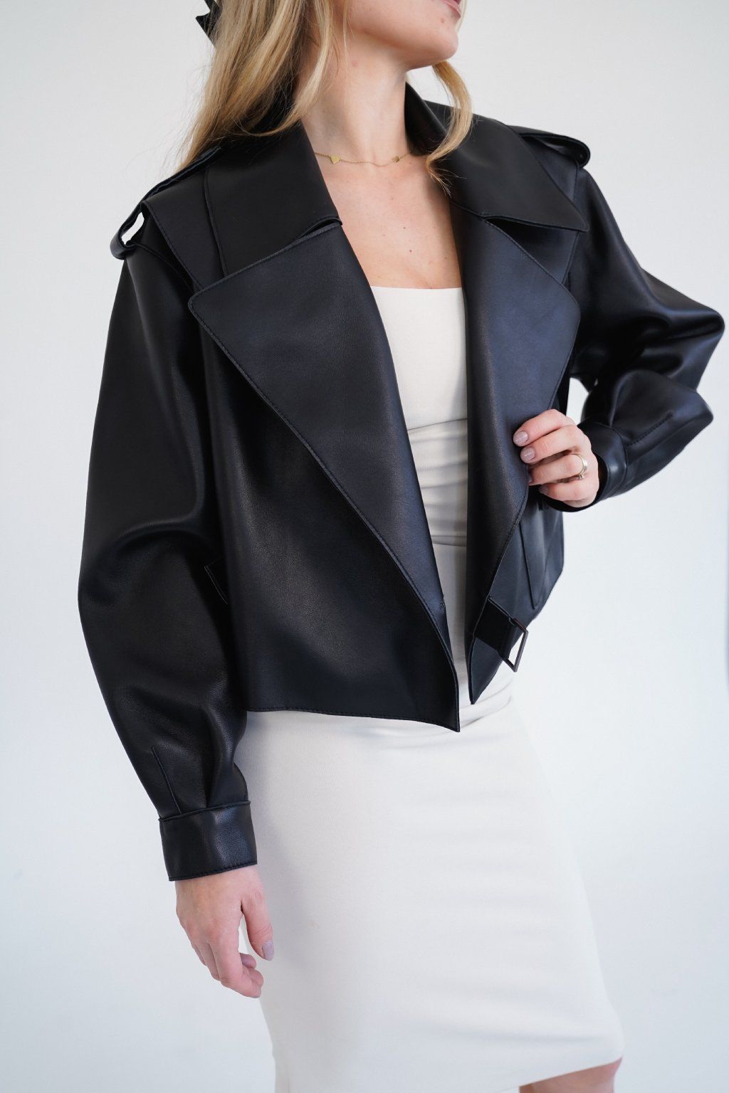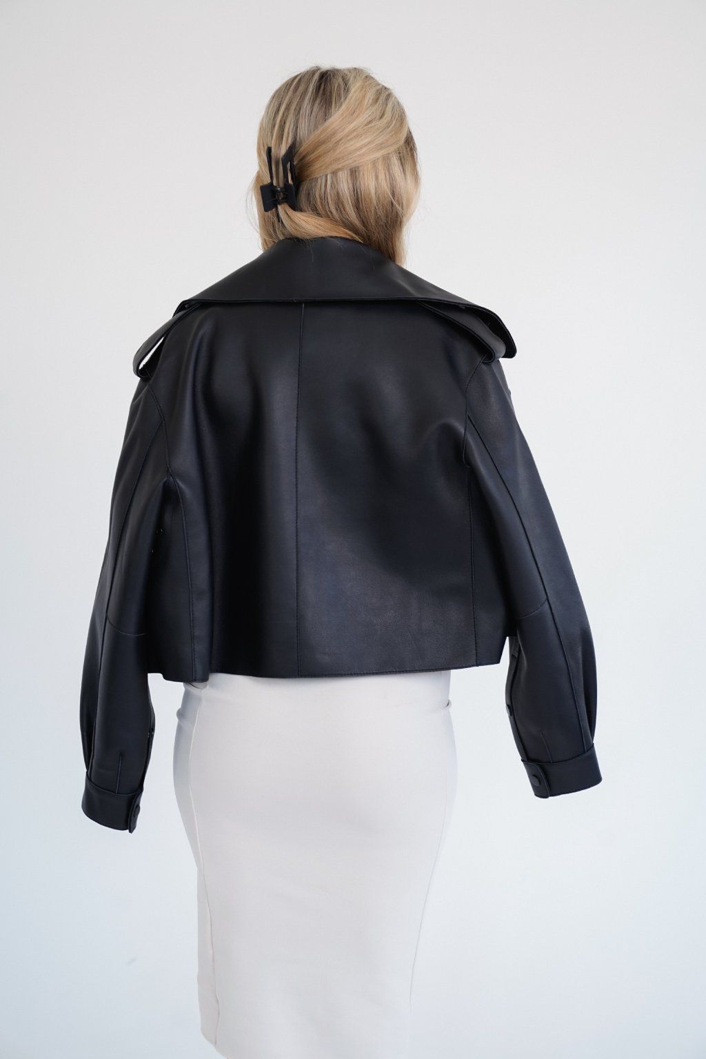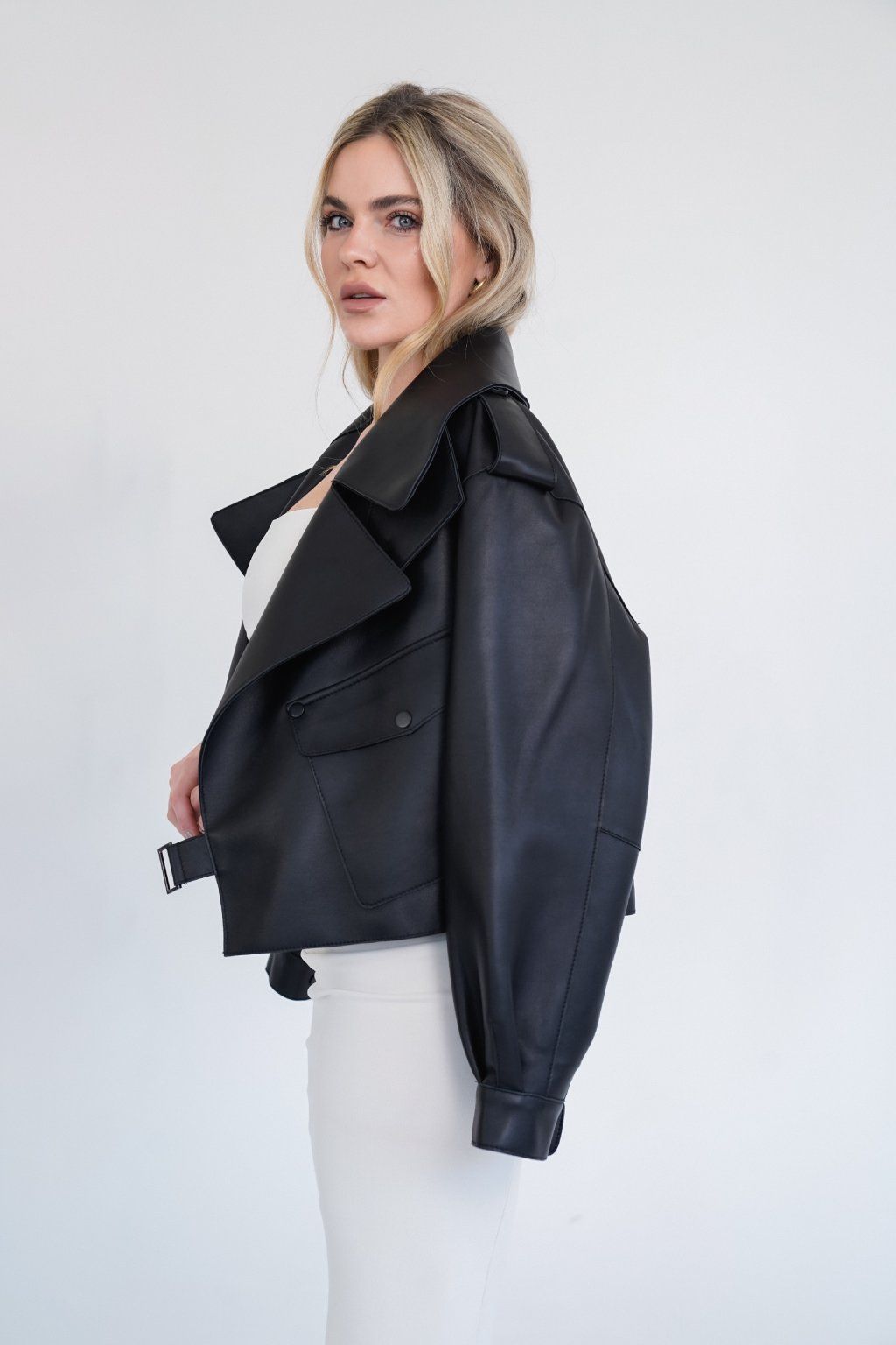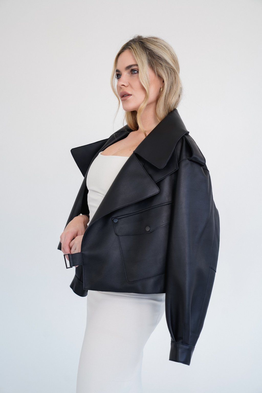 Women’s soft cropped oversized leather jacket. Premium lambskin leather with lining neoprene. Oversized fit and cool button & buckle detailing.The coolest leather jacket for all seasons.