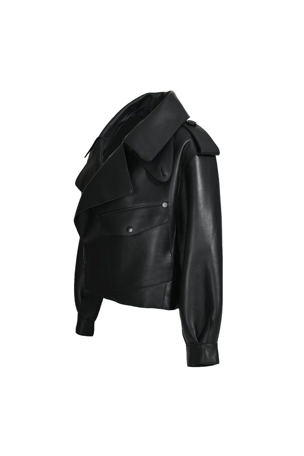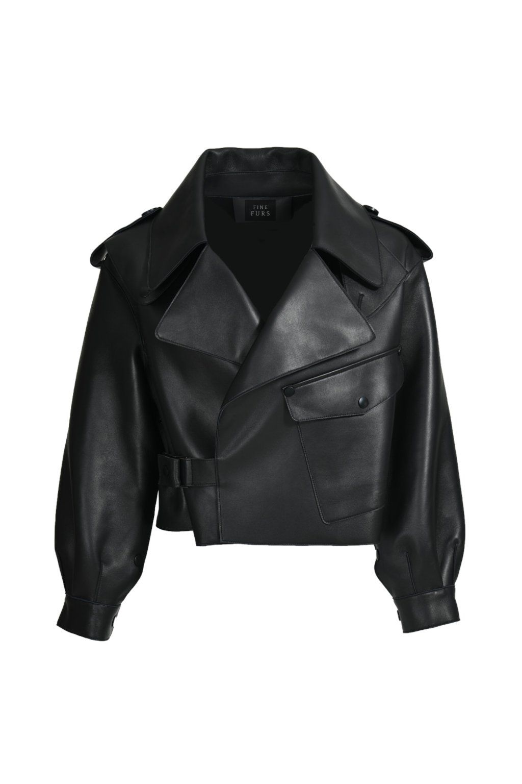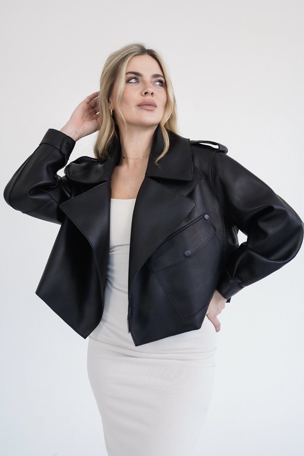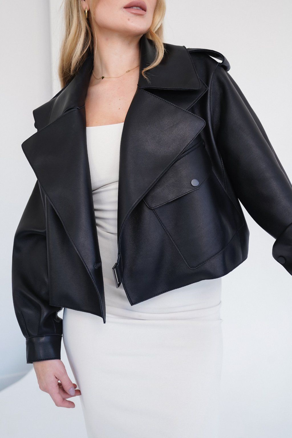 Women’s soft cropped oversized leather jacket. Premium lambskin leather with lining neoprene. Oversized fit and cool button & buckle detailing.The coolest leather jacket for all seasons.