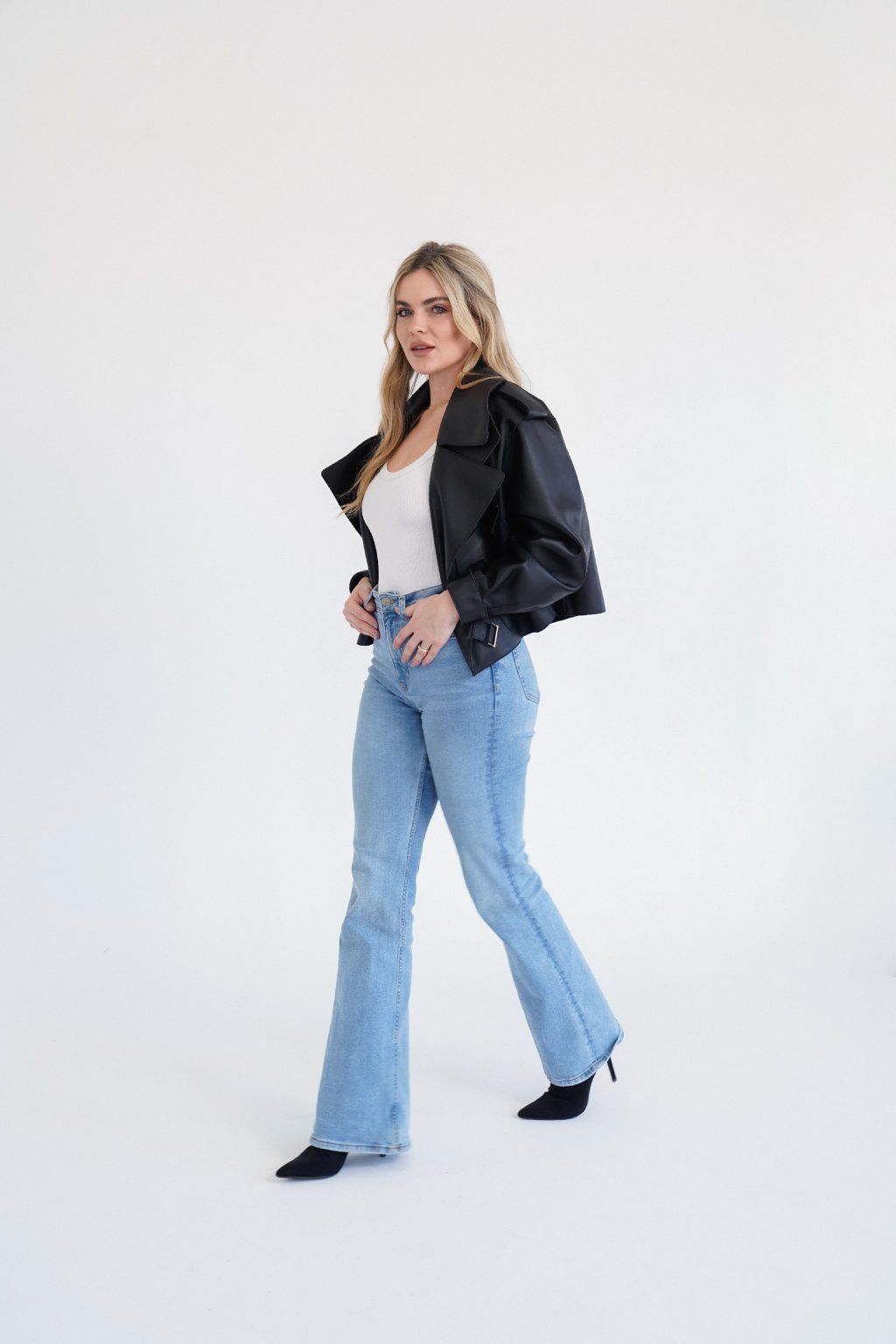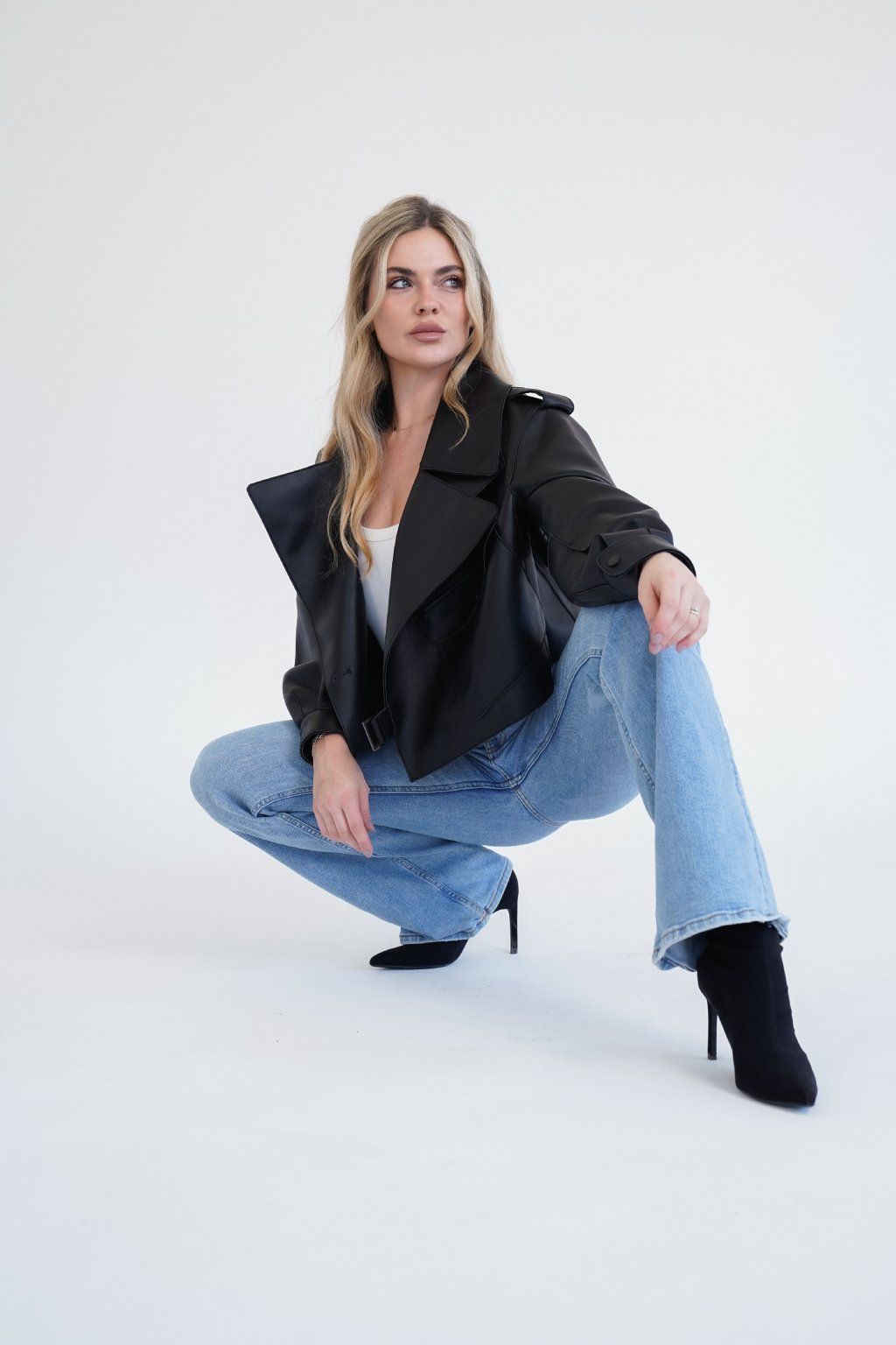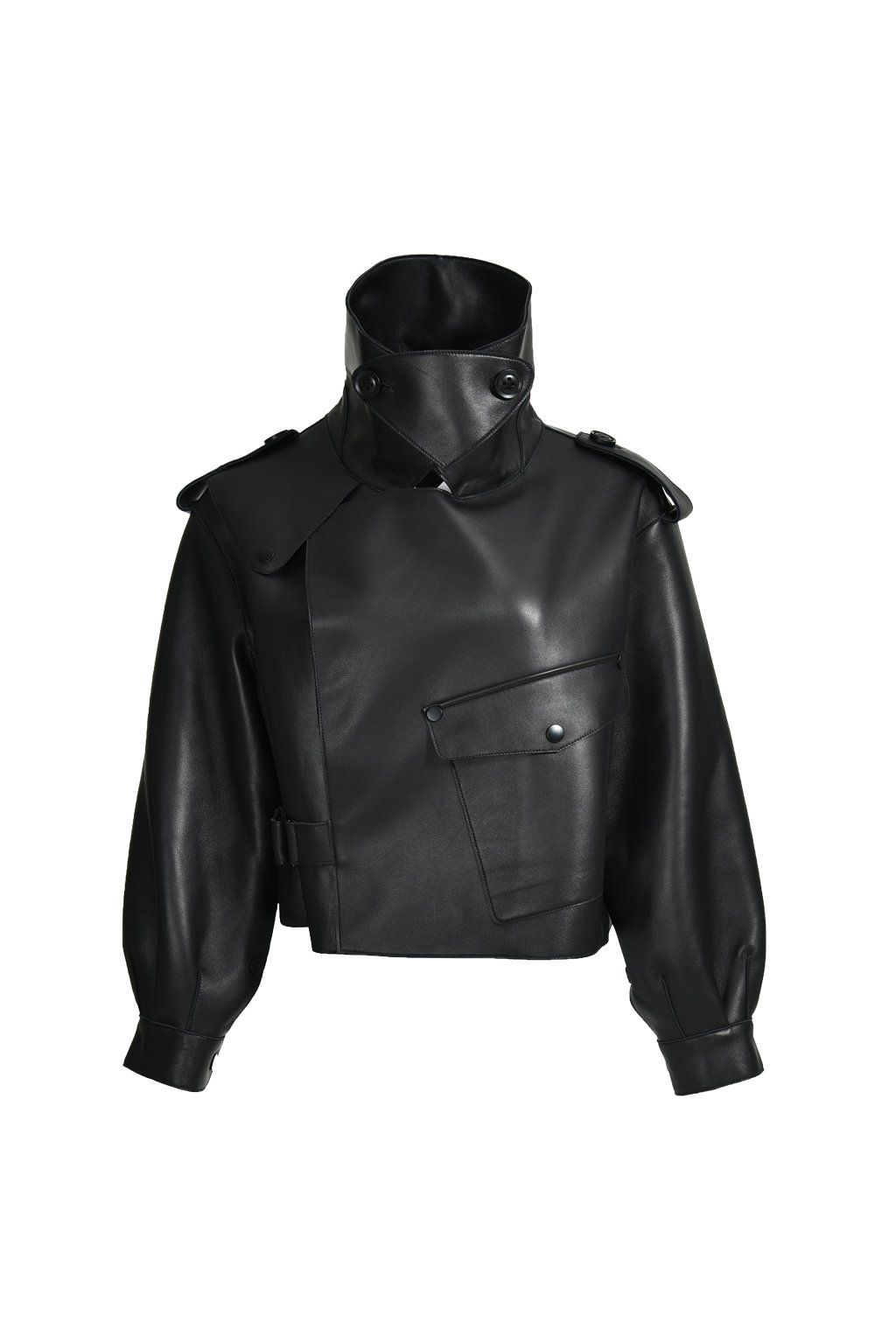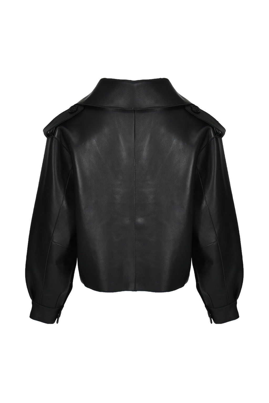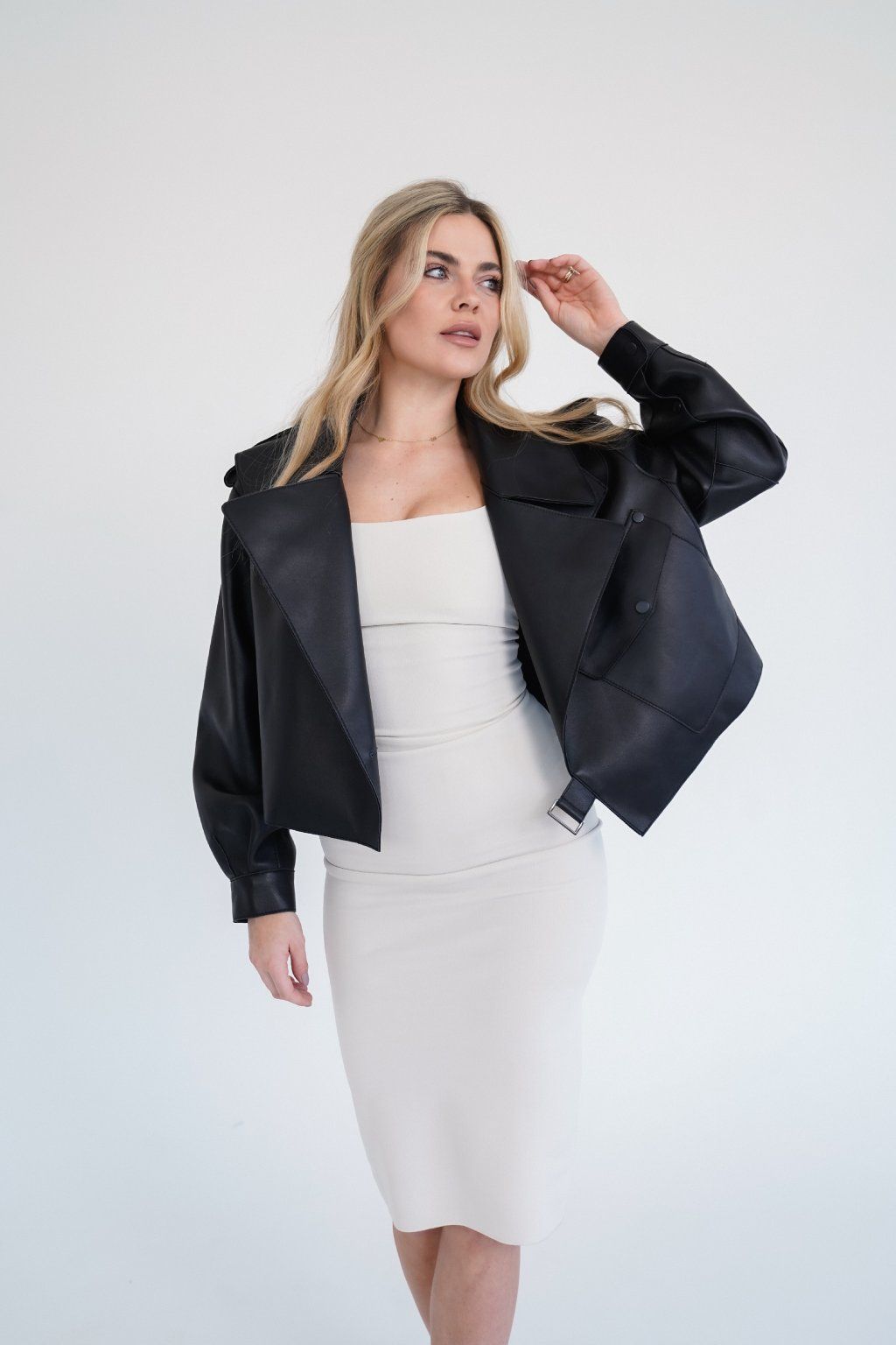 Women’s soft cropped oversized leather jacket. Premium lambskin leather with lining neoprene. Oversized fit and cool button & buckle detailing.The coolest leather jacket for all seasons.