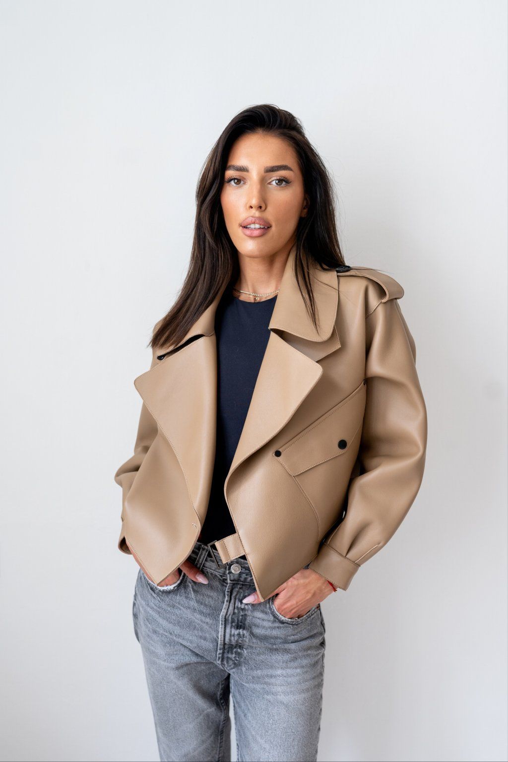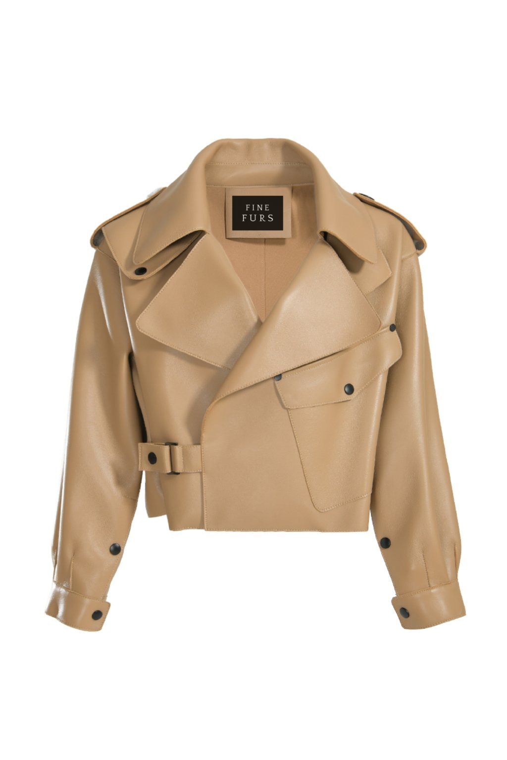 Women’s soft cropped oversized leather jacket. Premium lambskin leather with lining neoprene. Oversized fit and cool button & buckle detailing.The coolest leather jacket for all seasons.