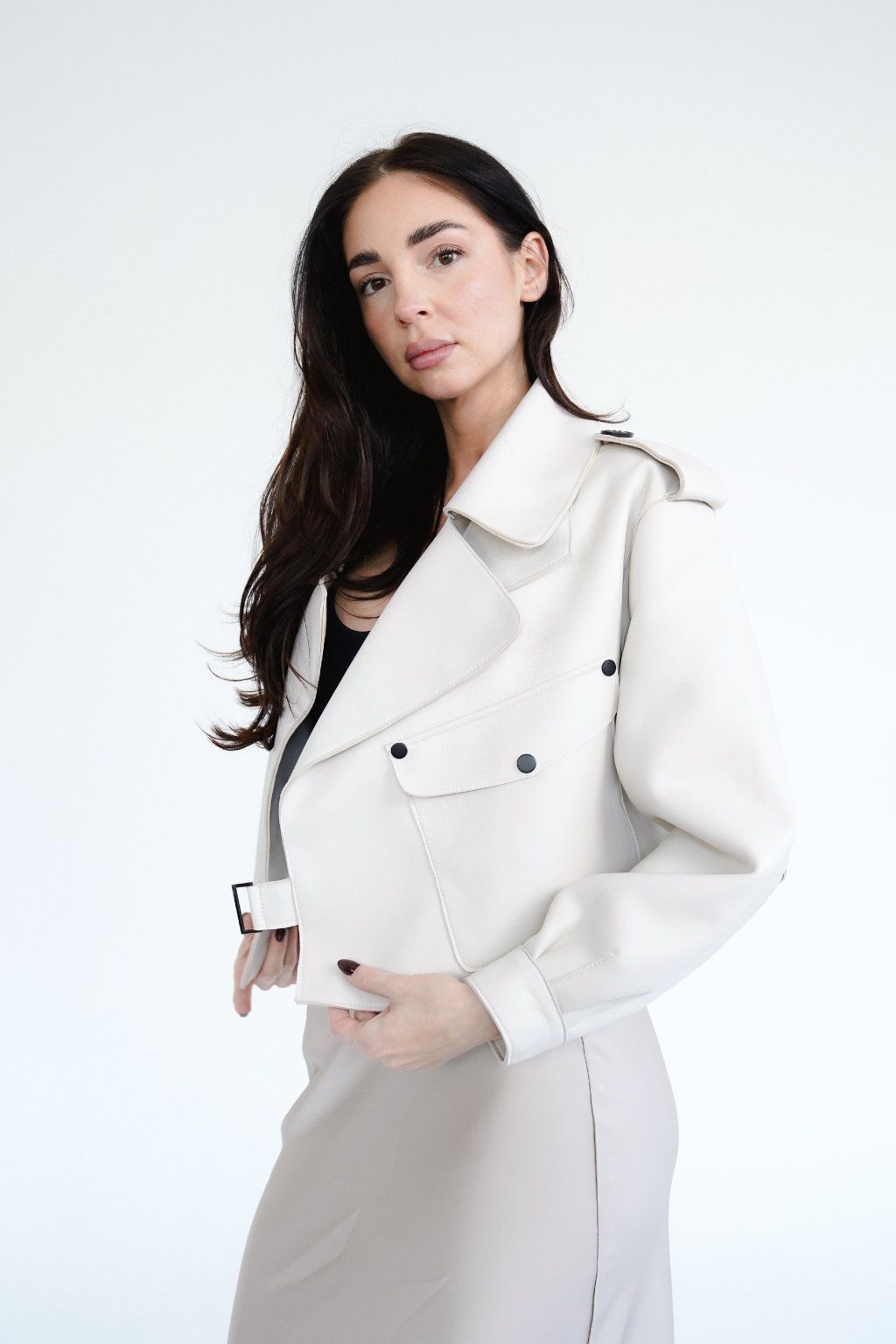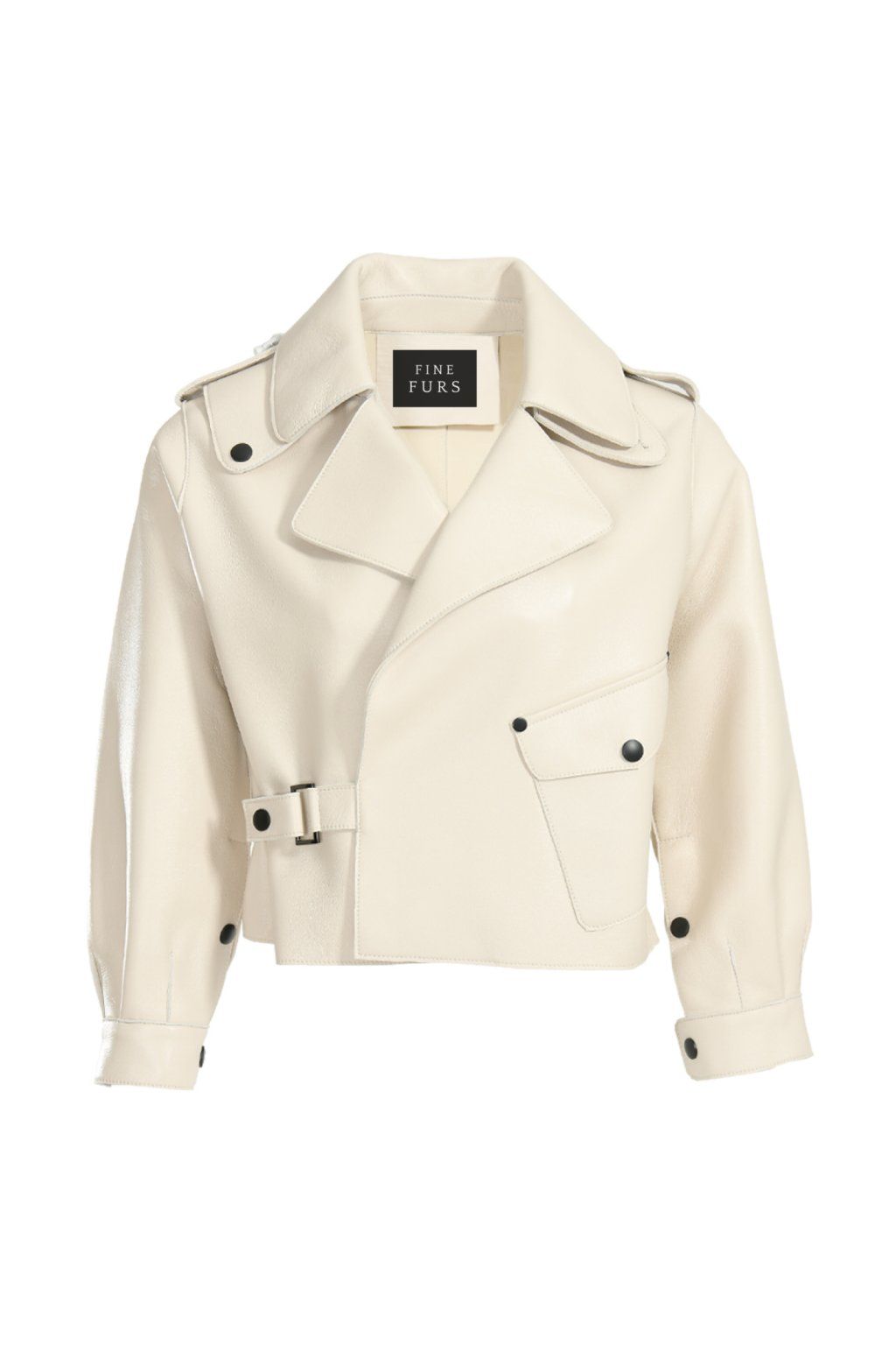 Women’s soft cropped oversized leather jacket. Premium lambskin leather with lining neoprene. Oversized fit and cool button & buckle detailing.The coolest leather jacket for all seasons.