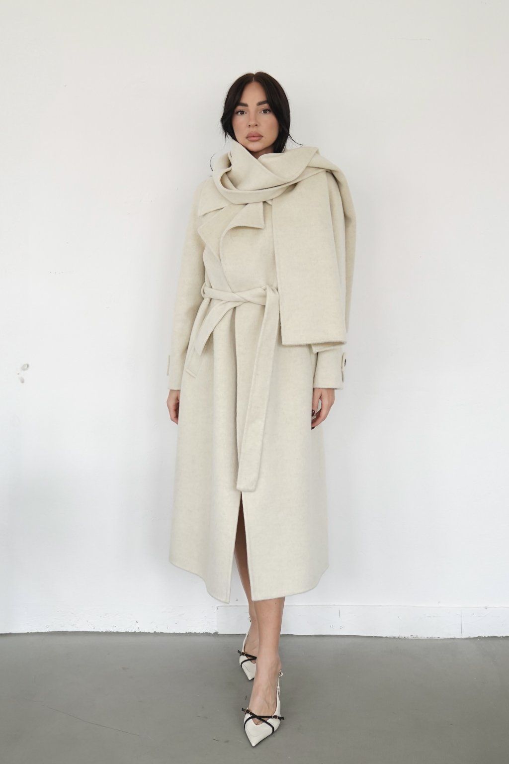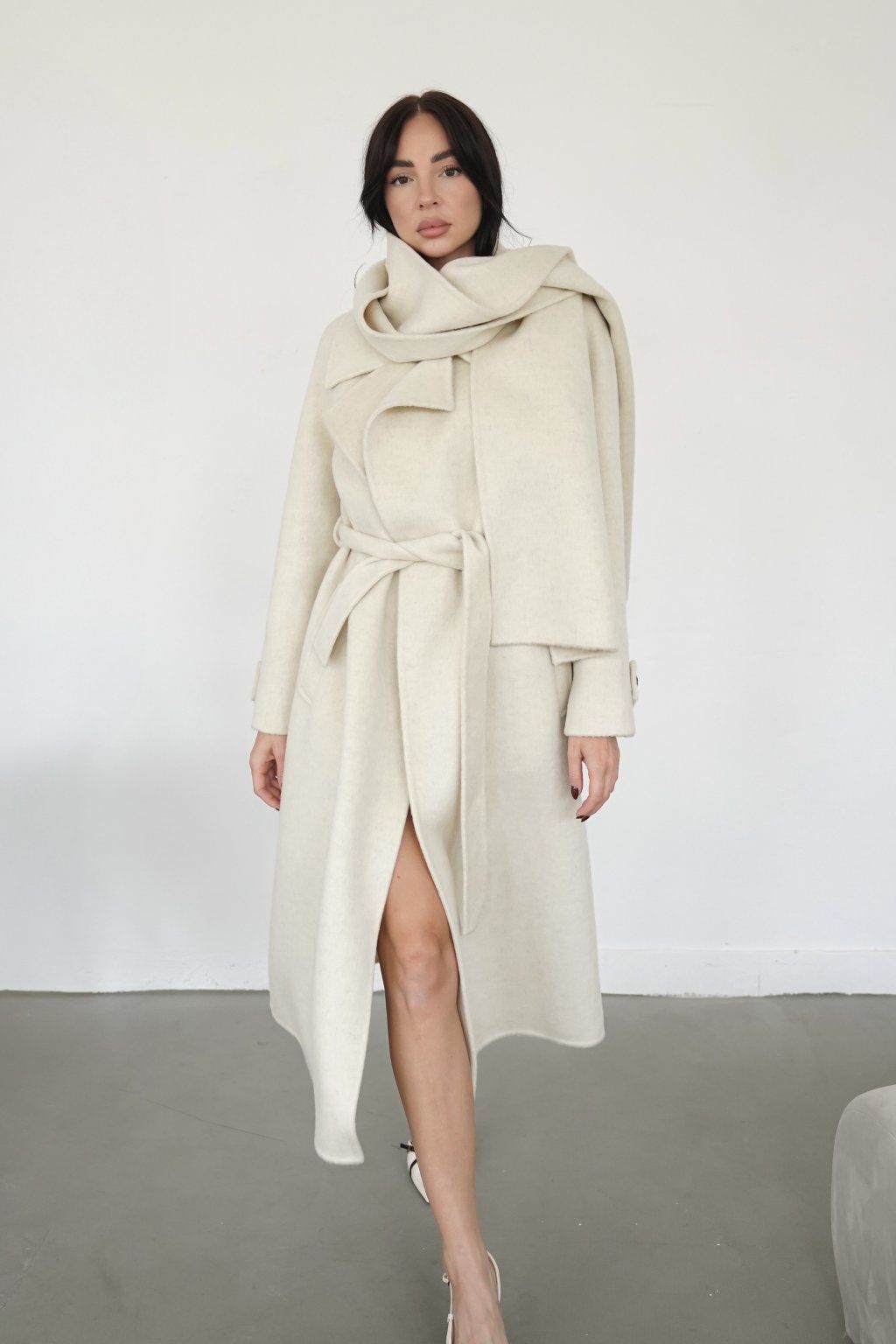 This timeless wool coat in an elegant cream colour is the epitome of sophistication and femininity. It is made from a high-quality wool blend that not only provides a luxurious look, but also warmth and comfort when worn. The coat includes a scarf made of the same material, which perfectly matches and allows for variable styling - you can wear it loosely draped, elegantly wrapped around the neck, or let it flow for an effortless chic look.