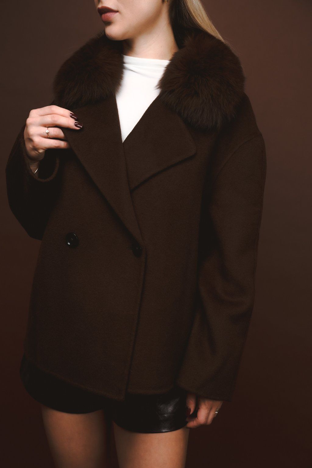 Elegantní vlněný kabát s kožešinovým límcem v čokoládové barvě. Je ušit z kvalitní vlněné směsi, která poskytuje příjemné teplo i v chladnějších dnech.