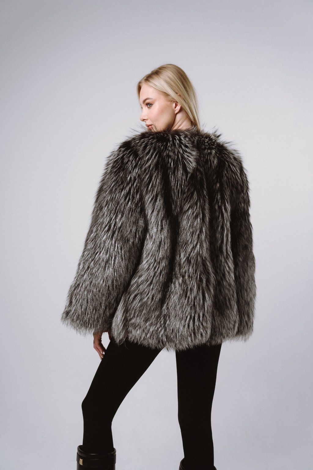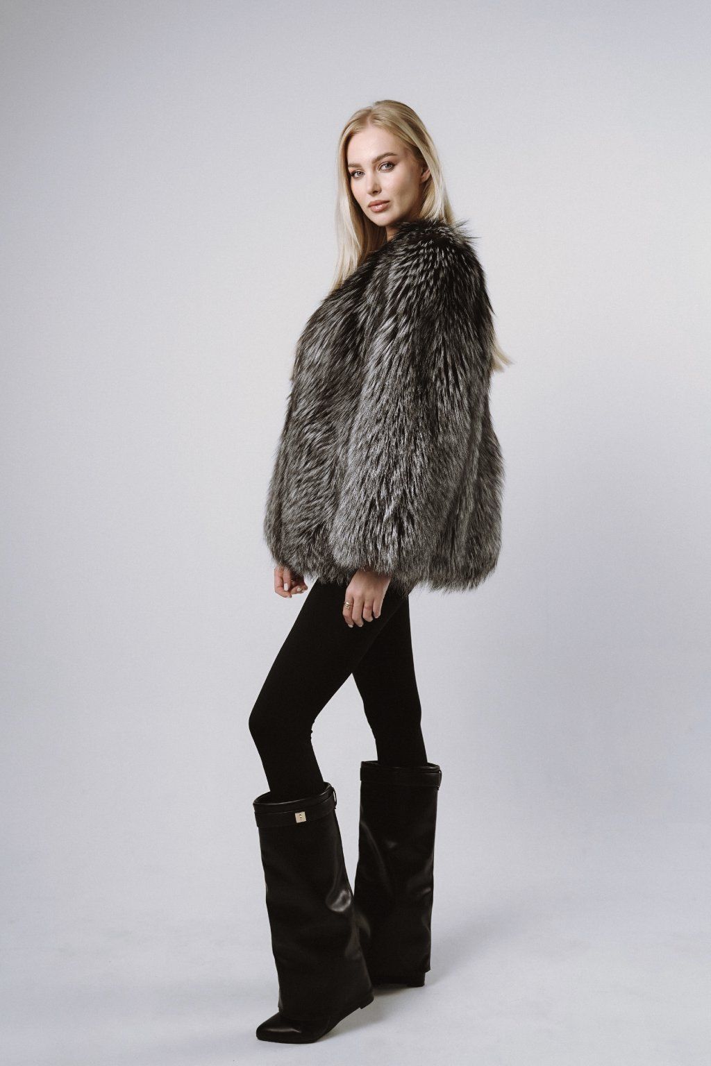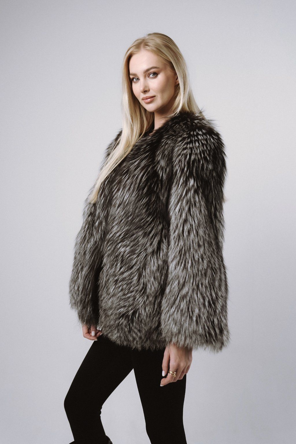 Luxusní kožich ze stříbrné lišky - mistrovský kousek evropského řemesla. Tento výjimečný kožich je symbolem nadčasové elegance a špičkové kvality. Ručně vyroben z certifikované kožešiny Saga Furs.