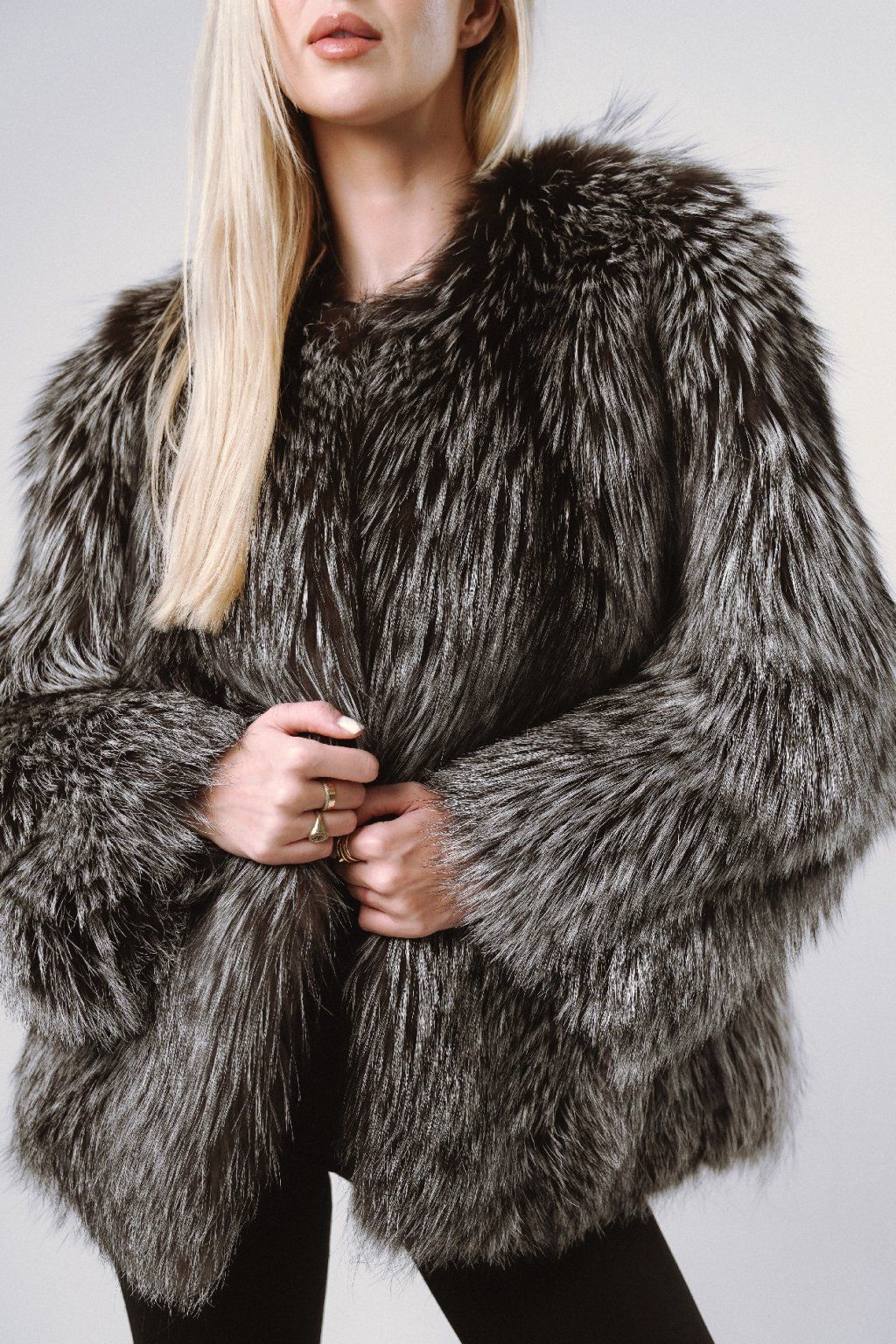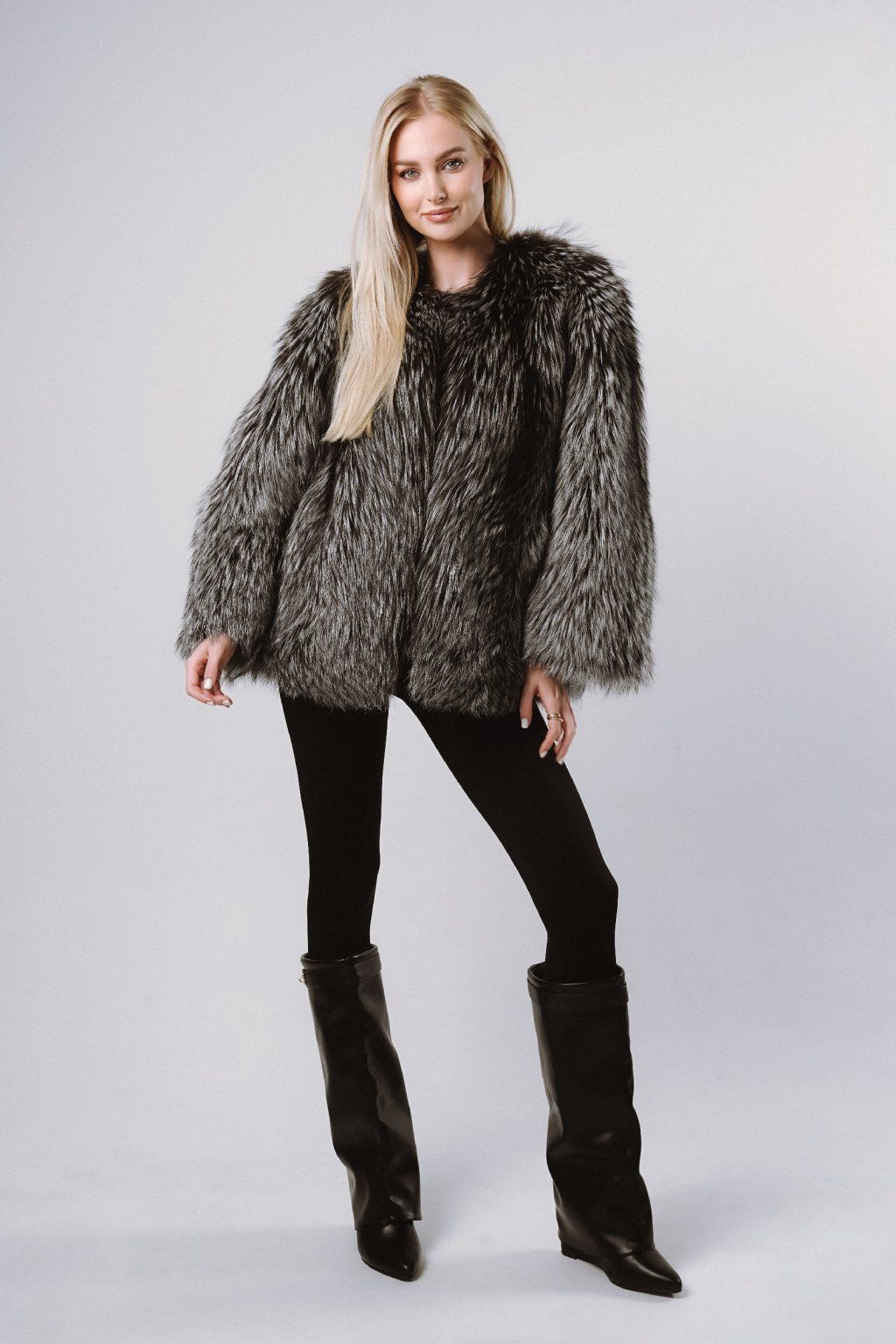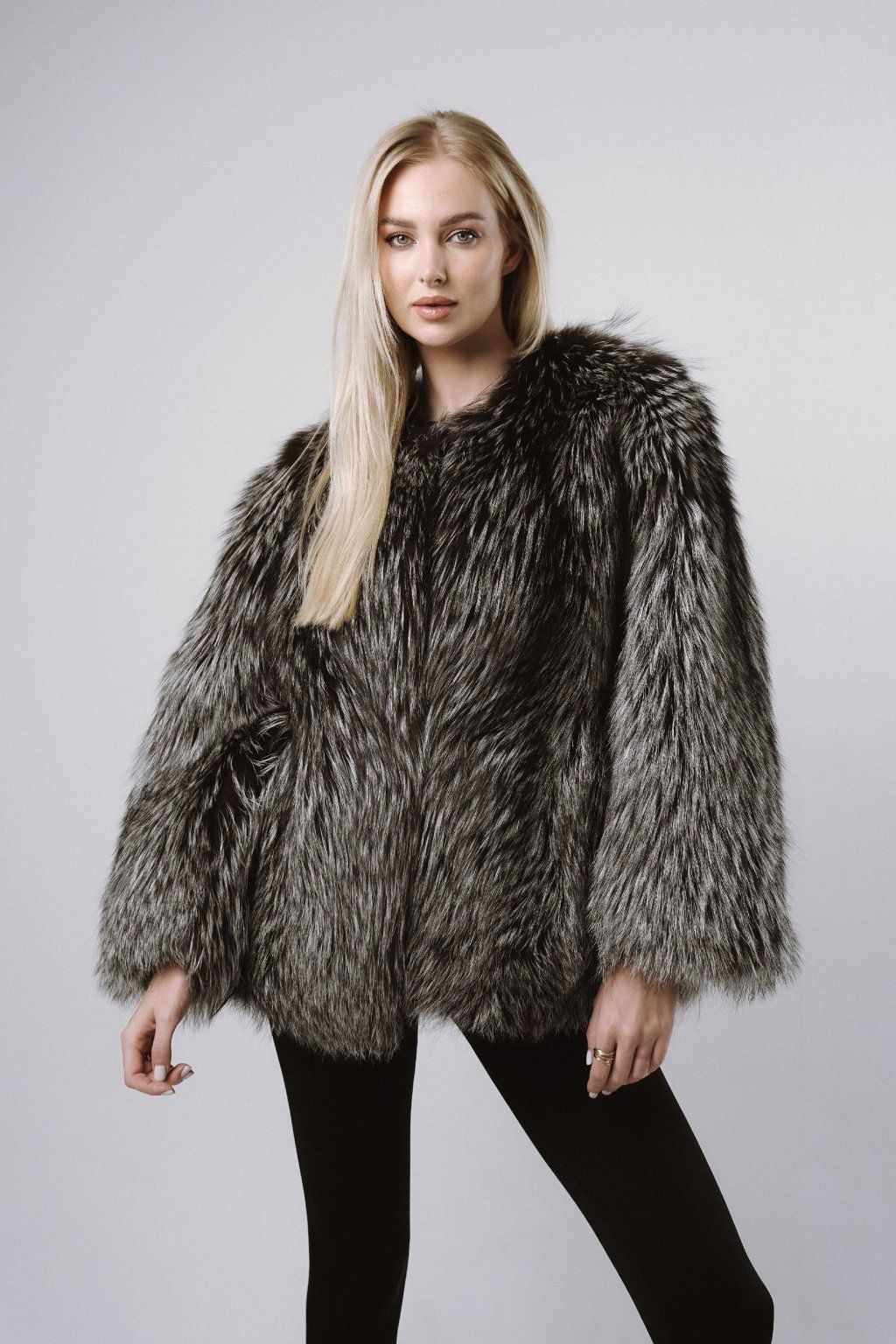 Luxusní kožich ze stříbrné lišky - mistrovský kousek evropského řemesla. Tento výjimečný kožich je symbolem nadčasové elegance a špičkové kvality. Ručně vyroben z certifikované kožešiny Saga Furs.