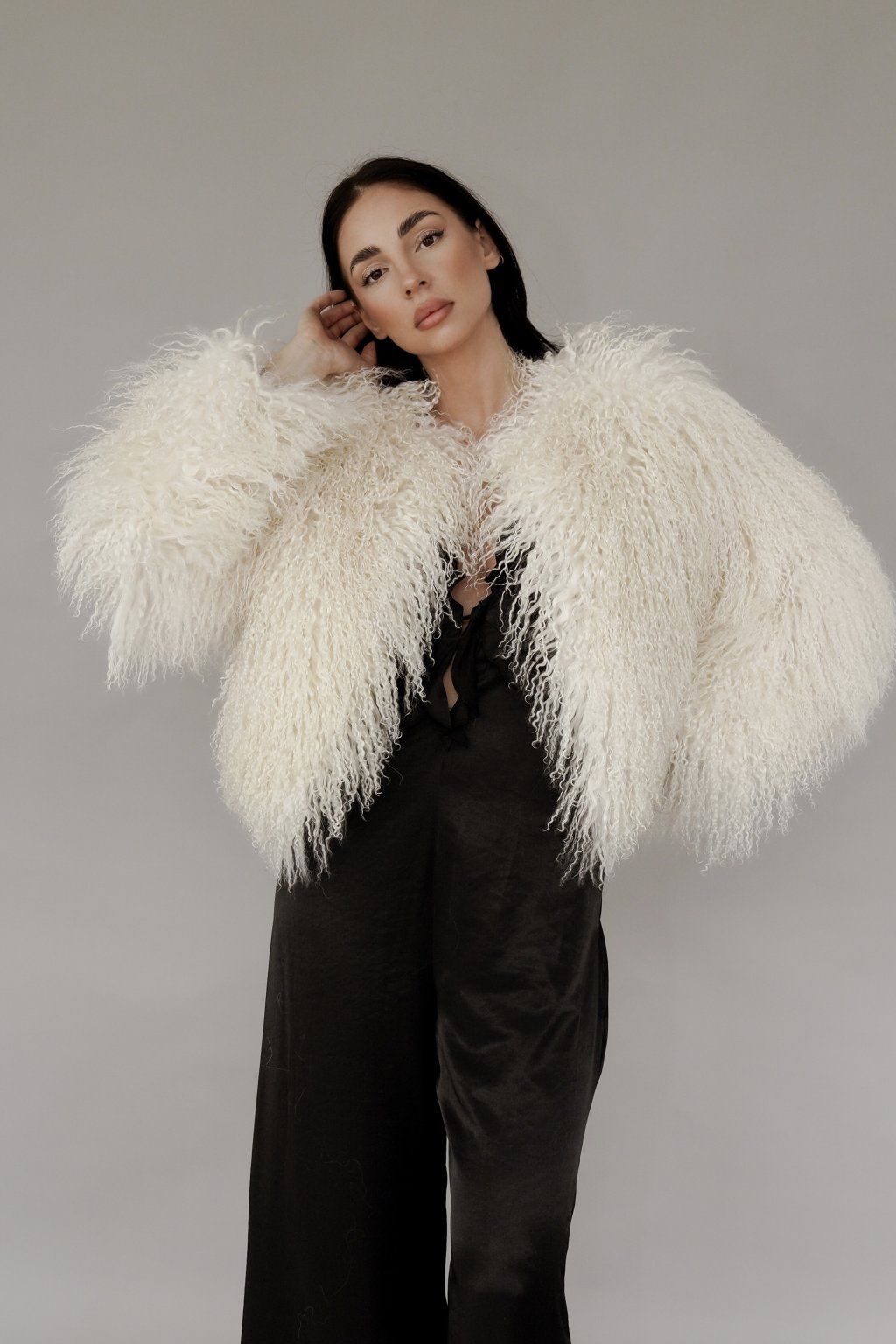 Kožich z mongolské ovce. Elegantní čistý střih bez límce. Minimalistický, nadčasový, krátká délka.